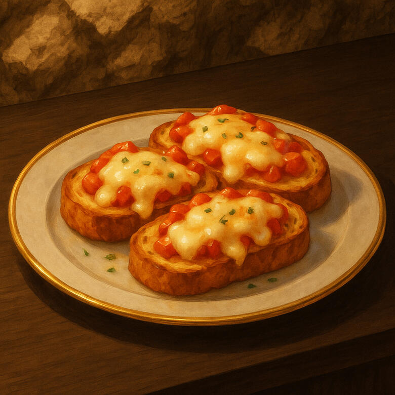 Golden-crisp bread slices layered with garden-fresh tomatoes and a bubbly blanket of melted cheese. Simple, warm, and irresistibly satisfying. This savory classic brings comfort with every bite.